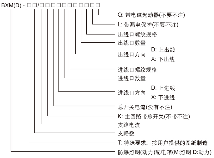 ● BXM(D)係類防(fáng)爆照明(動力)配(pèi)電箱,可根據用戶要求進(jìn)行特(tè)殊設(shè)計,用戶需提供(gòng)電氣係統圖。